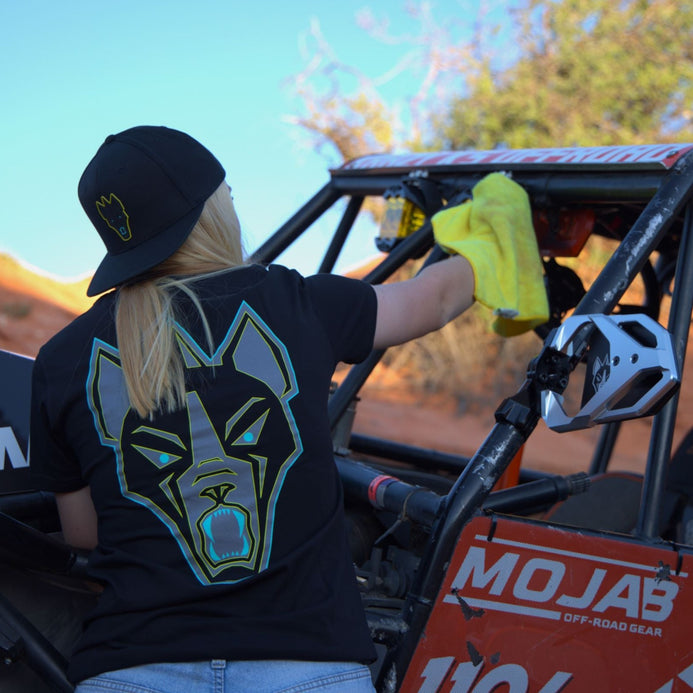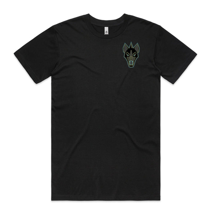 Chupacabra Neon Lazer T-Shirt with front left graphic print and all-over back print.