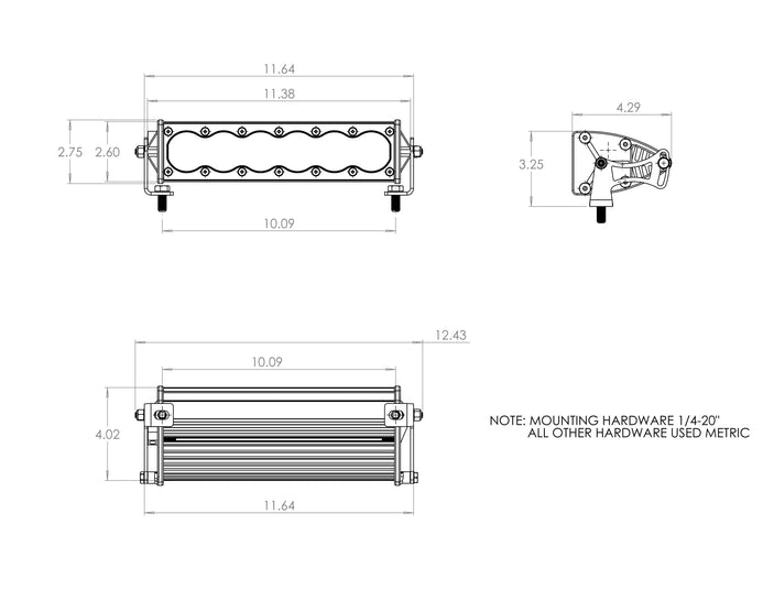 Specifications: Lumens: (High) 12,460 (Low) 9,230 Utilizing 6 LEDs Wattage/Amps: (High) 108W / 8.4A (Low) 80W / 5.7A Dimensions: 10" x 4.29" x 2.69" Weight: 4.25 lbs LED Life Expectancy: 49,930 Hours Front Lens: Hard Coated Polycarbonate Housing: Aircraft Grade Aluminum w/Mil-Spec Hard Anodize Bezel: Billet Machined Aluminum Hardware & Bracket Material: Stainless Steel Exceeds MIL-STD810G (Mil-Spec Testing) Built-In Overvoltage Protection IP69K (Waterproof up to 9ft & Pressure Washable) IK10 Compliant (Mechanical Impact Testing) |