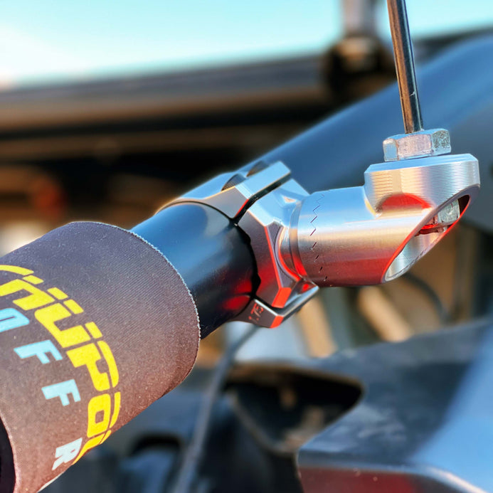 The Chupacabra Offroad adjustable angle flag mount can be used almost anywhere! Mount on a horizontal bar, vertical bar, or on a bar of ANY ANGLE. This mount offers a full 360-degrees of adjustability, in 15-degree increments and locks into position for a secure mount for any size whip.
